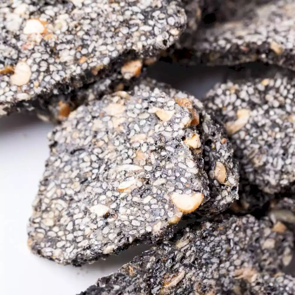 選用飽滿的日本黑芝麻跟台灣產地的台農11號花生 天然食材 低溫烘焙 保留完整營養 不添加任何香料及防腐劑 沒有蔗糖 純素食 黑芝麻跟花生與麥芽糖完美和諧地碰撞一起 吃完一片 没有罪惡感.
